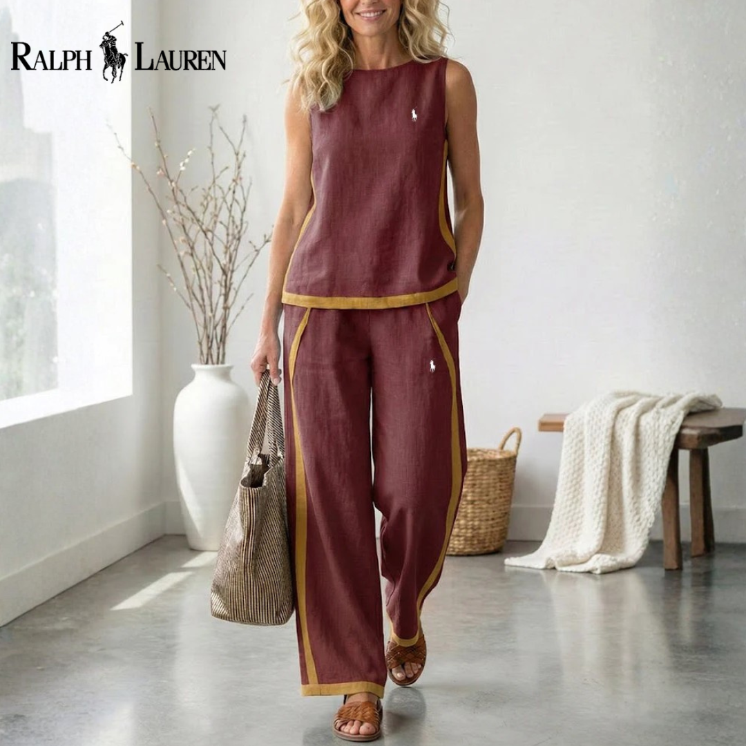 Crafted from lightweight linen fabric, the RL® Heritage Linen Sleeveless Two-Piece Set keeps you cool, comfortable, and confident throughout the day. The relaxed wide-leg trouser flows beautifully with every step, while the structured sleeveless top sits perfectly at the waist for a silhouette that flatters every body type. The signature contrast trim running along the edges ties the entire look together with a refined finishing touch.